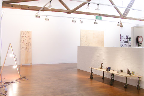 Christopher Hanrahan creates an arid no-man's land haunted by figures of speech. The speaking subject and his words are literally emptied out. Diaristic phrases - sometimes legible - are articulated by holes in humble plywood, a rendering of the void to which he corresponds. Light accentuates the objects like the volume of one's own thoughts. Hanrahan collects the sometimes paradoxical expressions by which we negotiate the subtleties and violent gestures of the social world. Snatches from embarrassed conversations, idle soliloquies and the laying down of paternal imperatives dissolve into their basic material components on close inspection or when viewed from the other side. The phrases also harbour semantic conundrums. Hanrahan's is a world where "it" is "nothing", "now" is more than "ever" and identity is an insubstantial thing. These are "slipped" portraits of the artist. The phrases imply an interlocutor - if only the walls - as the works imply a viewer. Hanrahan is witness to the pathos inherent in the scaffolding of our lives and pays lip service to and puns upon the suggestion of the Delphic Oracle: "Know (No) Thyself".