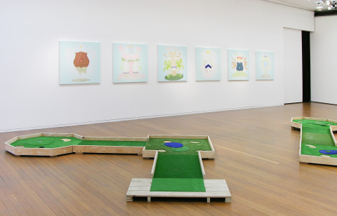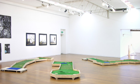 Newell Harry plays games with formal questions of arrangement and organisation. He makes sculpture - sometimes altered readymades - photographs and drawings. Sculpture is central to his practice. Harry often constructs objects from prosaic building materials which he has imbued with the aura of some mystical tribal artefact or the trappings of a lost cargo cult. These things then appear in his photographs where he has also inserted himself, playing out some energetic performance with the sculpture. This living element then haunts those images - formal still life arrangements - from which he is absent. Likewise, language provides Harry with more material for his formal antics. In his black and white text and number drawings (again employing tradesman's materials), Harry juggles the mutations and transformations of language in its various dimensions, exposing the arbitrary relationships between the meanings of words and the graphic and phonetic shapes of their representation. Words are minced and reconstituted into anagrams, rhymes and homonyms like banners of rude and dumbed-down poetry. A large sculpture - a found and altered mini-golf course - occupies the floor like a giant puzzle.