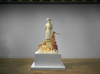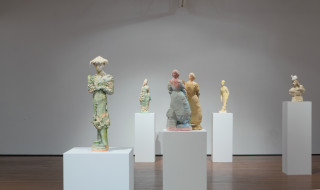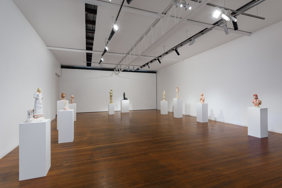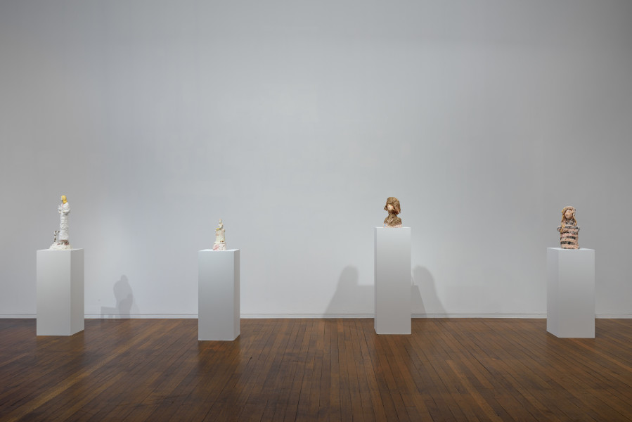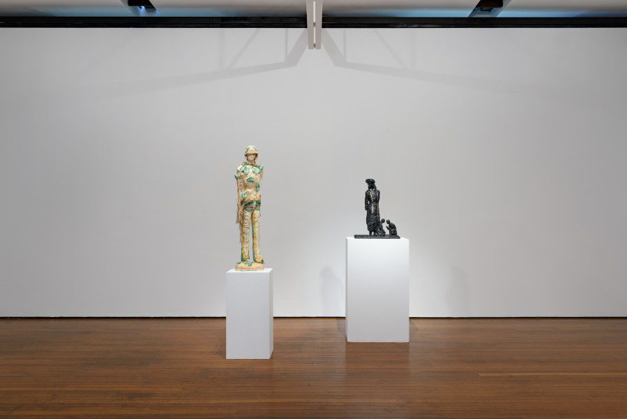 Executed in plaster and terracotta, coloured in delicate pastel tones and intimate in scale, these new works reveal the sensibility and touch of the Melbourne sculptor. At once playful and grave, the works utilise a wide range of media. Woman with a white dog (2020) appears entirely made of white cotton wool. Woman in a forest (2020) wears a cloche hat from the 1920s and is draped in a hessian shawl covered in leaves. Woman with fan (2020) seems to have stepped out of a Fragonard while master French couturier Paul Poiret appears in costume for a fancy-dress party in 1914. And the sombre, black figure of a young Australian dressed in the “military” style of the First World War years, enlivened with gold buttons, turning thoughtfully away from two children playing, represents a proposed monument to the experience of those left at home, waiting during wartime. Marrinon’s works are often a meditation on character and the human condition; an invitation for introspection. Armed with technical brilliance, Marrinon is free to indulge in idiosyncratic proportions and the pleasures of the handmade.
