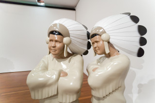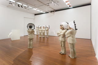 The gallery is filled with ten almost identical indian figures, which, like the children’s song, is an exercise in counting learnt through melody and repetition. They are based on the artist's sons as his earlier, now iconic, Kapa Haka 'security guard' sculptures were based on his brother. Like the security guards, the indians stand looking at the viewer with arms crossed across their chests. However, where the security guards were inscrutable and imposing in scale like a human wall, the indians are diminutive, curious and almost 'chattering'. They are (brown) brothers, posing (reluctantly) perhaps for the tourist camera.