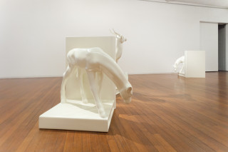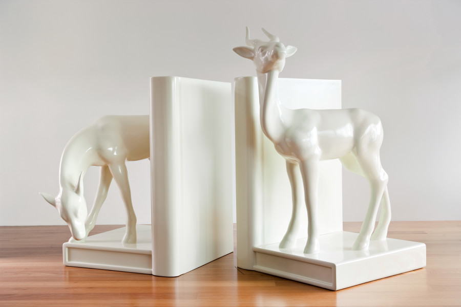 Also in the gallery are three antelope sculptures on plinths. Seldom is Herd consists of one buck and two doe—a self-sufficient community—that also take the form of bookends. While the antelopes seem to be the ‘nature’ component of the equation, they are also co-opted culturally as porcelain figurines—now life-size.
