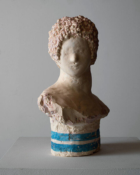 Linda Marrinon’s sculptures are an enchanting mix of classicism and whimsy. They are formal works that reference art history but remain playful through Marrinon’s approach to proportion and scale. The figures exude a certain confidence as they inhabit the character or period ascribed to them. But these striking personas emerge somewhat unexpectedly from the sculpting and casting processes. Marrinon does not begin with a specific character in mind, instead allowing the process to guide her. Accidents and technical surprises become features and textural details that are richly suggestive of a particular character or period. Marrinon then completes the figures with carefully considered sartorial details, often formed from plaster-soaked muslin or hessian. The warmth and suppleness of the fabric draping is retained through the process. Just as ancient Greek and Roman sculptures were brought to life with colourful paint, Marrinon’s classical figures are enlivened with pigmented plaster and decorative accessories.