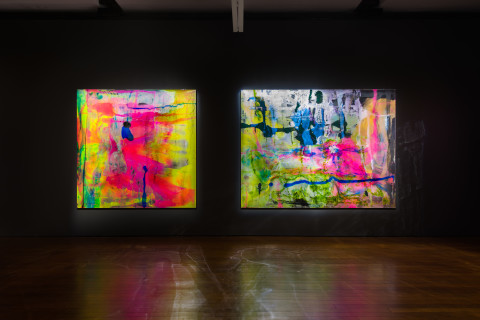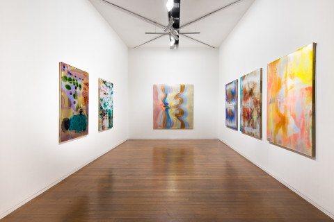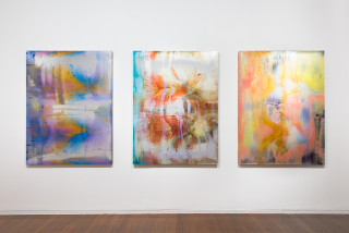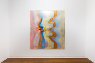 With the new addition of powdered pigments, there is a watercolour-like translucency to these dazzling new works that make them shimmer in ethereality, like floating cosmos, lost in the dream of a summer’s day. At times with a glaring vibrancy, they draw us in. They are addictive: swirling layers that seem to capture eternity and defeat time.