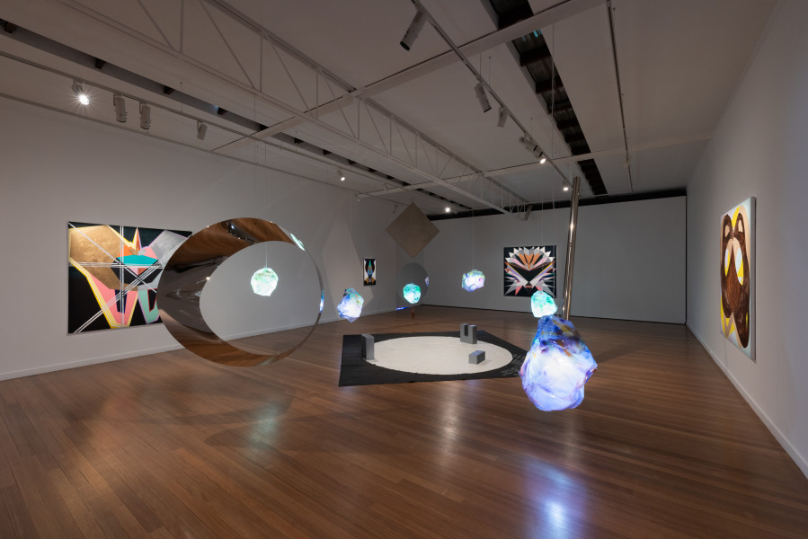 The glinting, illuminated circle – reflective, shiny, jewel like – has a magical quality and a mystical calmness. The large mobius of polished metal hovers in space, casting its spell around the room populated with paintings whose surfaces are crystalline patterns and abstract shapes. Suspended, colourful synthetic rocks glow from within their irregular bodies. A polished metal drop of disk and diamond captures colour shapes and more reflections into its mirror finish. A hessian fabric tree and mountain – we know so because they are named – indicate a wooded, alpine landscape.