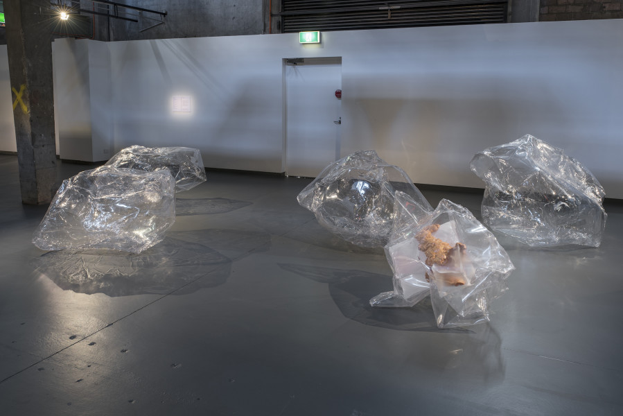 The materials in this exhibition encompass air, inflatable nylon, unfired clay and plastics bags – materials that have been co-opted for their versatility and their mutability between function and emotion. Some of the works in this exhibition require activation – such as electricity or inflation to become whole while others inhabit their softness quietly.