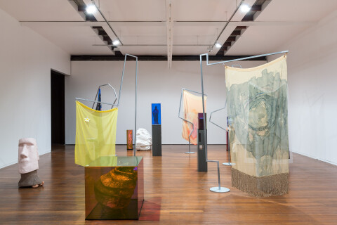 Five delicate flags mark the way as we navigate Mikala Dwyer’s installation Soft Relics. Steel supports distort and bend under an omnipresent weight conveyed by the totemic relics that surround them.