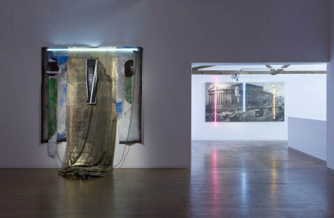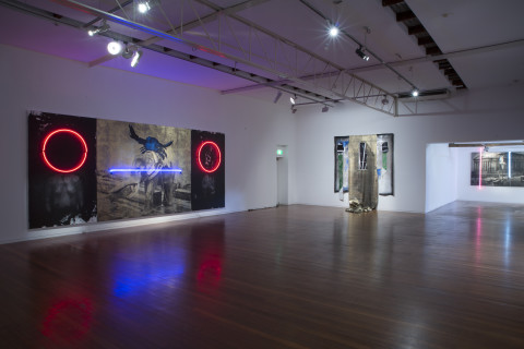 Space & Time is a moody immersive group of works incorporating neon, screen-print, collage, sculpture, photography and painting. This is the first time Brook Andrew has actively presented a group of works that span these mediums, together with images from his personal and other archives.