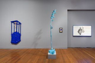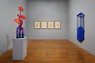 With an apparent disregard to what exists before, in Spade (2019) the greedy tongue ascends a garden shovel to dig the earth, to expand and to build. In Blue Cabinet (2019), a multi-coloured plant based on the species depicted in Untitled 317 (2019), is contained within a glossy blue cabinet: perhaps a metaphor for the quest to control indigeneity, or for the human desire to assert power over its organic environment. The use of “Untitled” for the works on paper acknowledges the colonial imperative to rename land and species, allowing one to think about indigenous methods for disseminating knowledge and the multiplicity of different cultural modes for recording and retelling history.