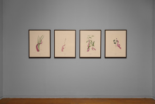 In Untitled 335, 317, 72 and 7 (2019), Rothwell modifies works from the Florilegium by taking a scalpel to these delicate forms, slicing the image to entwine a pink tongue, hand painted in watercolour, amongst the foliage. With the precision of a surgeon, the artist carves up the past and leaves it wide open. The English pastoral idyll is interrupted.