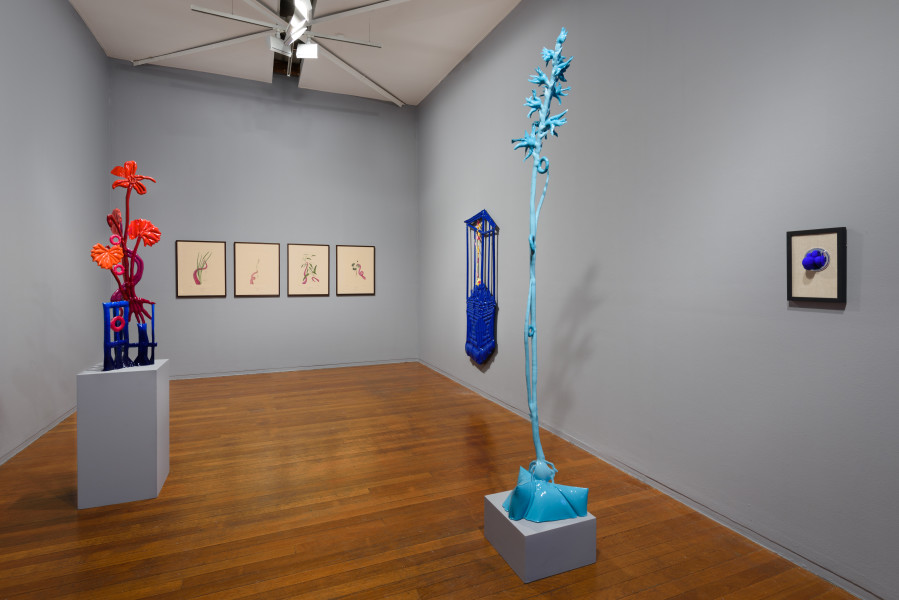 Coated in the liquid shimmer of shiny gloss paint, Rothwell’s sculptures are otherworldly and fantastical, embodying a sense of wonder, that first point of discovery, exotic and collectible. Symbolic of imperial voracity, the tongue writhes and twists amongst Rothwell’s sculptures, three of which incorporate the botanical species from the works on paper.