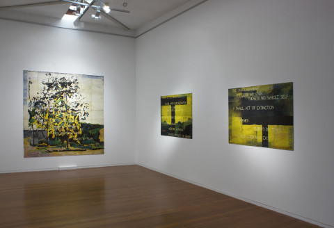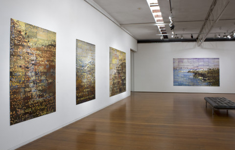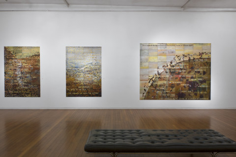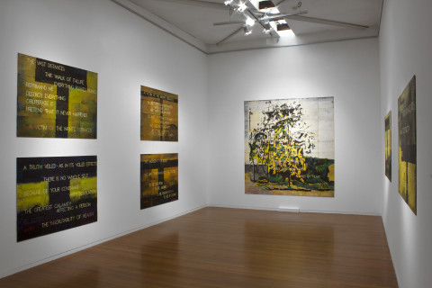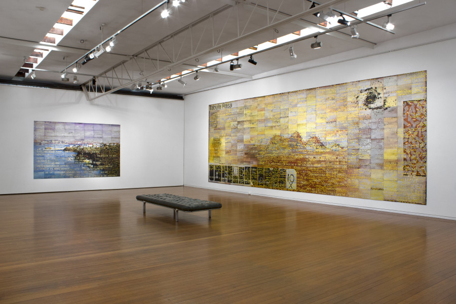 In Tabula Rasa the central image is based on one of Fred Williams’ paintings of the Pilbara region in Western Australia - his Karratha Landscape. Tabula Rasa is a companion to the 9th painting in the Diaspora series that was titled Lacrimae Rerum (2007) and was dedicated to my mother. This painting is for my father who passed away in 2001 – he was also named Imants Tillers. When I was growing up, my father, who became a talented mechanical engineer working for the company Macdonald, Wagner & Priddle, travelled to remote parts of Australia. He went to places like Kwinana, Port Hedland in the west, Weipa, Gladstone to the north – places where he was designing coal loaders, gantries and other materials handling infrastructure. He was even involved in the design of the Siding Springs telescope at Coonabarabran in NSW and the first off-shore oil drilling platforms off the Western Australian coast. In this work I wonder what he thought of the vast, barren Australian landscape he was compelled to traverse – having grown up in the gentle, intimate landscape of Latvia.