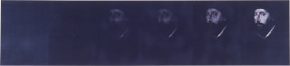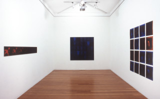 Lee's familiar grids combine monochrome panels with calligraphic wax spills and digitally-reproduced faces that disappear into an inky darkness. The explosions of black or coloured wax stand for the transforming energies of the universe. They are sensations that shiver across equanimous pools of colour.