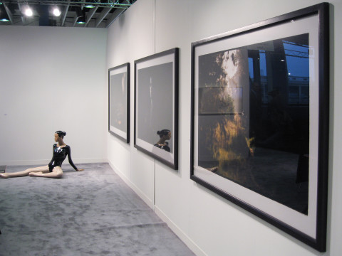 Jacqueline Fraser collages photographs with an eclectic mix of French haute couture, including faux fur, wigs and silk taffeta. Fraser uses long quotes laced with violence as titles for these works, drawing attention to the materialism and artificiality of high culture. For Armory the works have been framed within their own shallow black display case, further emphasizing the exhibitive purpose and emotional emptiness of high fashion.