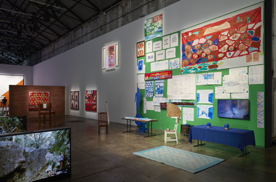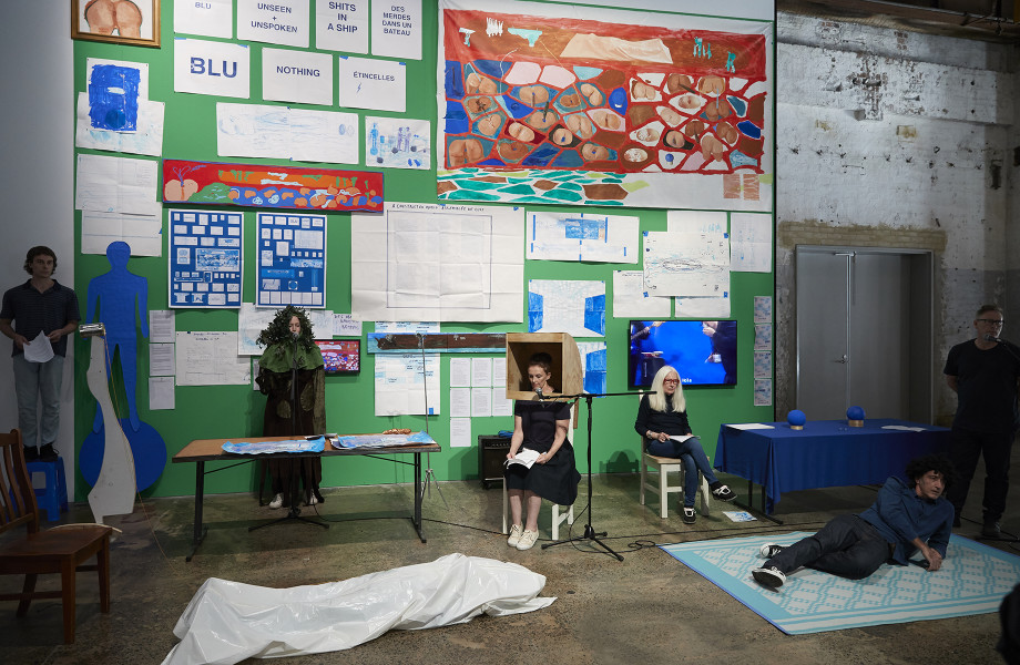 The installation – Partition #13, Ass Assembly / Assemblée des culs – is both an archive composed of all the above forms (image, text, performance etc) but most of all of ideas emitted in communicative acts, itself a situation occasioning an evolving set of performances. Assemblée des culs is an installation and performance work that first took place in Paris in 2017 and is reprised here for The National. The ground of the work is a large section of gallery wall painted green-screen green. This is a colour used as a chroma-key backdrop for live action filming, effectively holding space for a scene to be layered into the image. Across this wall is displayed an accumulation of elements. There is a prominent painting of buttocks and arseholes – a celebration of the body’s abject counterbalance to reason, knowledge and language. There is a monitor for video performances and a table in front of the wall that highlights the installation’s character as a setting – and a set – for ongoing performance. The work is an accumulation, but also a careful selection of archival material that acts simultaneously as document, art object and score. An archive generated by and pertaining to its prior iteration in 2017, it is also a sourcebook of sorts for new interactions and performances. This cycling of ideas and forms is emphasised by a painted plan for the wall installation that has been incorporated into the display by the artists.