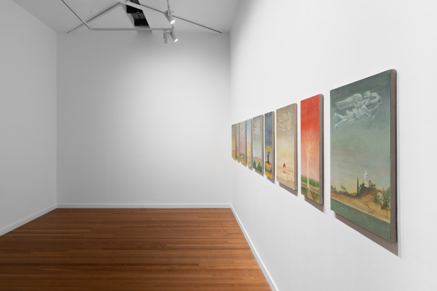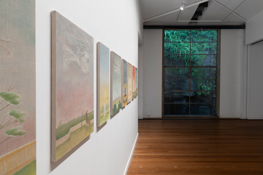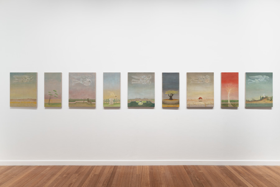 A new suite of paintings from Vivienne Shark LeWitt, The Wind Cries Mary, 2023–2025, draws together visual archetypes and cues associated with our inner life and conceptions of soul, spirit and self. It takes inspiration from the enclosed garden of the Virgin Mary, as well as the Greek myth of Psyche and her ‘labours’ to transcend her earthly world and be emancipated. For LeWitt, Psyche’s story represents the ‘task of survival’, while the garden is a place of protection – ‘simple, undemanding and humble’.[1] Weaving together both ideas, she creates an imaginary allegory of individual freedom and agency.
