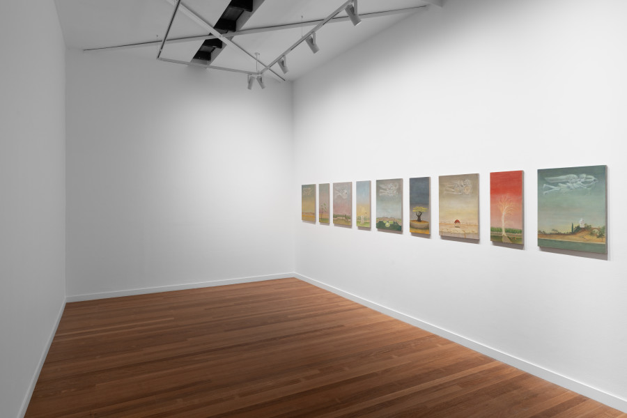 LeWitt’s gardens are interspersed with references to Psyche, the goddess of the soul. LeWitt was drawn to the beneficent power of nature in Psyche’s story, represented by the gentle westerlies of the wind god Zephyrus, which enable Psyche to triumph over death. In her depiction of the wind deities – the southwest wind (Livas), the west wind (Zephyrus) and the northwest wind (Skiron) – and their attributes, LeWitt adopts imagery that draws loosely on the Roman friezes found on the Pýrgos tōn Anémōn (Tower of the Winds) in Athens, considered to be the first meteorological station. But, unlike the heaviness and heroism depicted on the real sculptures, LeWitt’s figures appear light, summoned into the atmosphere and hovering above a small strip of landscape at the base of each canvas.