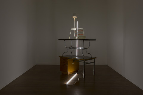 In the current exhibition there are elegant variations on the ‘bottle combinations’ that extend the lifetime of a series yet to time out after more than twenty years. There is also an assemblage, Time Tables (2018) of a timeworn Latimeresque wood and metal desk providing the foundation for a stacked chrome table and a plastic seat-table-lamp-combo that read like fresh-faced reissues of post-war moderne. They are pierced, or united perhaps, by a neon tube. The tube might even be seen as an archaeological measuring device, calibrating and illuminating a vertical time line of things recovered from the midden or décharge of discarded objects. Culbert has reunited these ‘objects of my affection’, as Man Ray called his versions of Duchampian readymades, in time for their performance of his time-tested wit.
