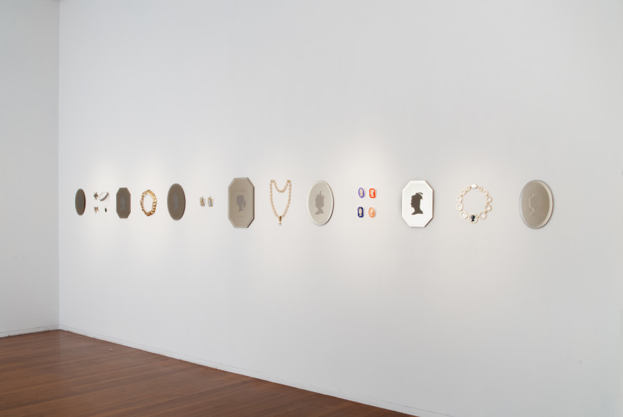 Full of autobiographical references stemming from childhood rummages through her grandmother’s jewellery box, Cook uses the cameo to explore the possibilities associated with commemorative portraiture. While conveying little information about the subject, immortalisation in cameo format confirms the significance of the sitter. Playfully rendered large-scale in brightly coloured acrylics, sentimental symbolism is eschewed by her selection of benign subjects including herself, her family, even her cats. Her choice of media catches us off guard too. She sets laminated colour photocopies in sterling silver and her cameos and ‘pure gold’ chains are acrylic. Mixing the intimate with the official, her disingenuous jewellery challenges conventional notions of value, offering a contemporary, conceptualised take on the traditions of costume jewellery.