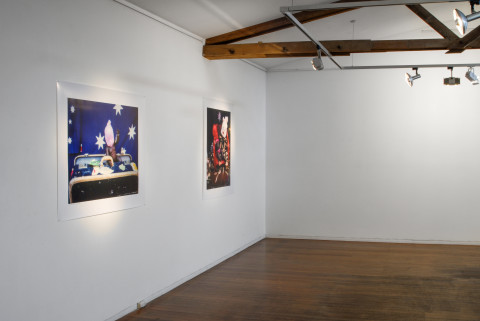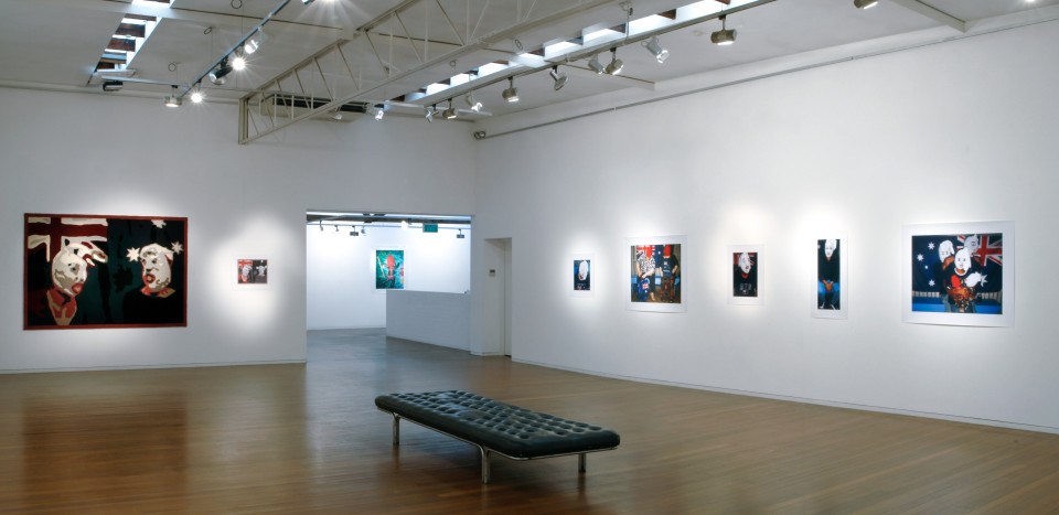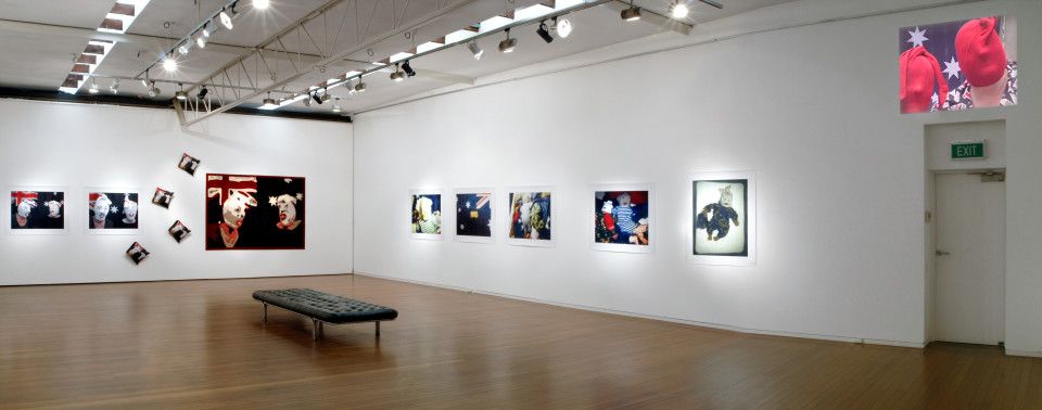 Flags, dolls, and hooded figures are the props and characters that inhabit Destiny Deacon’s latest series of photographs, videos, carpets and cushions at Roslyn Oxley9 Gallery. Deacon typically draws her inspiration from the realities of contemporary cultural politics and in Whacked her themes traverse terrorism, surveillance, subjugation and nationalism. Playing at stereotypes, Deacon and her friends have masked themselves in long-johns and assumed the role of Aussie fanatics, re-enacting current events with sinister humour. Crudely drawn faces, with messy lipsticked mouths, send up the anonymity (a tool of fear) sought by masked terrorists. The comic faces remind us that Deacon’s world is make-believe, a game of role-playing and performance carried out in the domestic sphere where negative stereotypes are problematized and drained of their power. Deacon’s collection of Australiana and dolls populate the various scenes creating a continuous slippage between artefact and character. The dolls often find themselves in grotesque and absurd situations: decked out in military camo, armed with a wooden spoon, or emerging masked from a suitcase. The resulting photographs hit you in the gut. They are playful, intriguing images laced with Deacon’s wicked sense of humour.