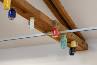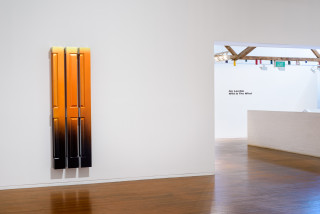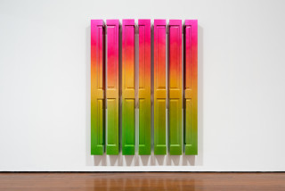 Wooden doors, meanwhile, are sliced up and stuck back together to make columns. Spray-painted vivid orange, blues and greens, they represent the rising or setting sun: the opening and closing of various metaphorical doors. Their titles – such as “Sunrise (Meadow Lark)” or “Sun Up (Gold Finch)” -- reference songbirds who warble as the dawn breaks.