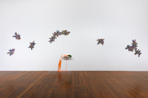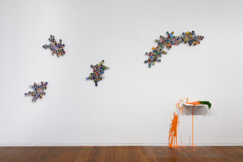 Lambie is obsessed with colour: from bold primary blue and red to richer, burnished bronze and brassy gold. In his new video installation “Self-Portrait (in seven parts)”, the artist raises a spray paint can in his studio and, slowly, soaks the screen. The action is repeated again and again with different shades. And in his performance work “14 Carrots” (the title is a play on 14-karat gold) the artist dips bog-standard supermarket carrots in different paints and hits a white wall, allowing the wet pigment to dribble down, staining the wall.