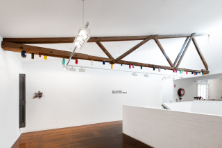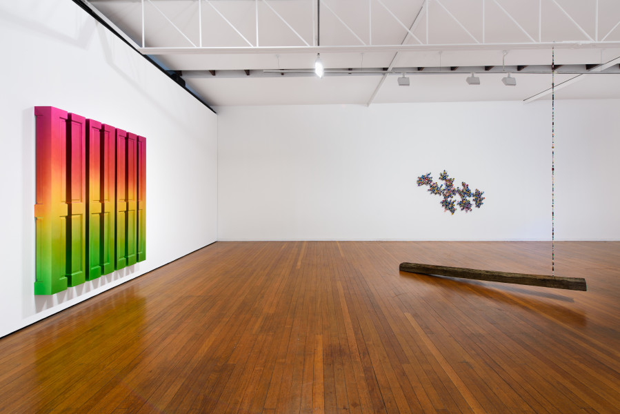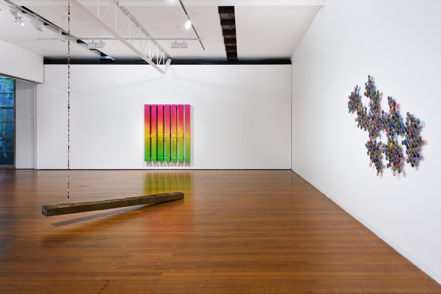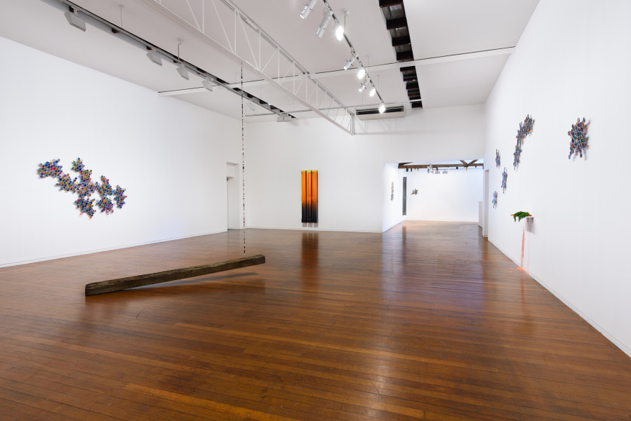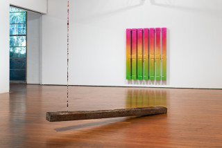 In the middle of Roslyn Oxley9 Gallery sits an old wooden railway sleeper – once used to bolt the train tracks to – suspended by a string of beads from the ceiling.