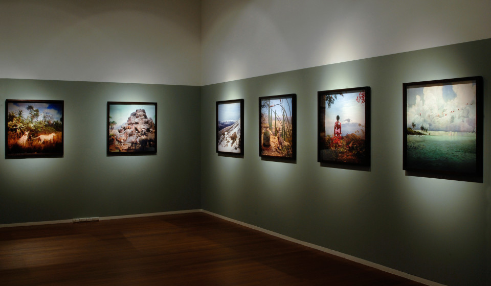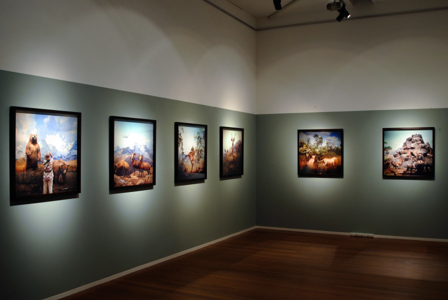 Anne Zahalka’s exhibition, Wild Life, presents ten high-gloss photographs featuring actual dioramas from the American Museum of Natural History in New York. Part readymade, and also a site for manipulation and intervention, Zahalka’s images of these famous dioramas bring into question the display practices of museums and the position of authority they reinforce with regard to knowledge, classification and collection. The world outside the museum has changed too however, with ready access to information and ease of travel. Why visit a museum when we can research via internet, watch re-enactments of dinosaur stampedes on TV, or pay for a spot on an eco-tour?