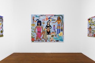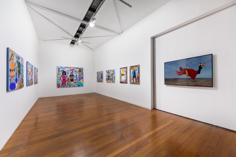 Recent international articles on contemporary art have argued that much art today seems fixed to talking to the art world tent, ideologically driven and lacking life, empathy and feeling. Kaylene’s colours, arrangements of fabulous figures (Cher, Dolly Parton and Tina Turner) in action and play in their everyday rituals and fun, have character, intelligence, positivity, and sheer joy in a sea of anxiety.