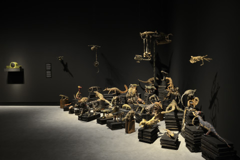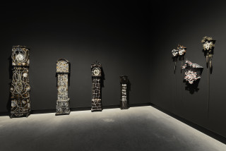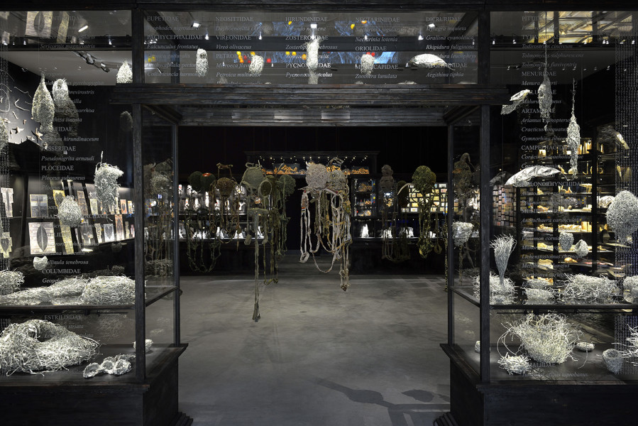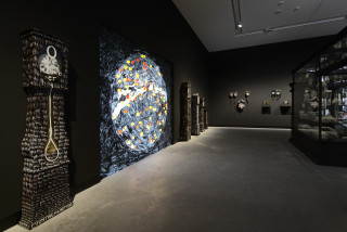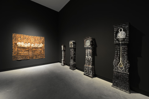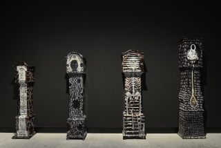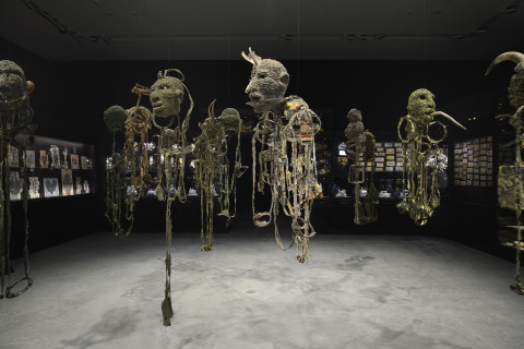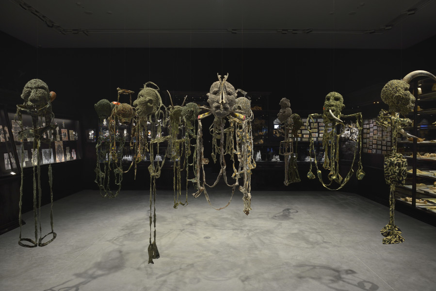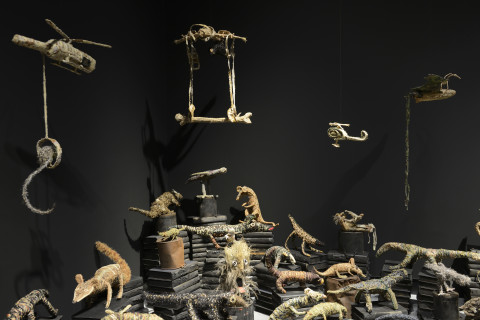 installation of sculptures made from Tjanpi grasses (wild-harvested grasses including minarri grass), synthetic polymer yarn, wool, raffia, wire, camouflage military garment fabric, cotton and linen thread, buttons, ininti seeds, bamboo, emu and bush turkey feathers, buttons and camel teeth, on billy cans and burnt volumes of the British Museum's General Catalogue of Printed Books: Ten-year Supplement, 1956–1965