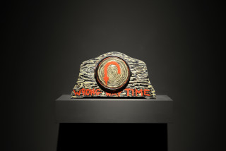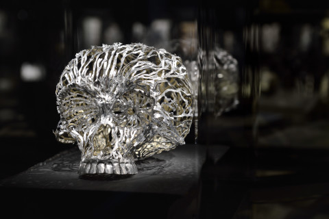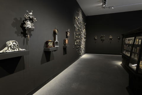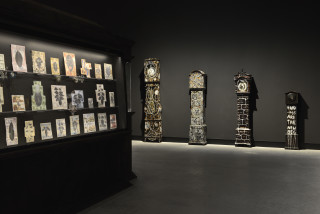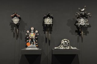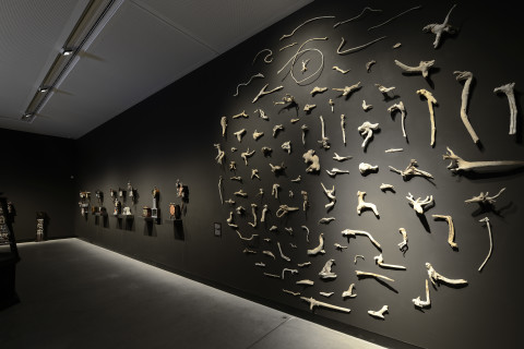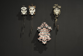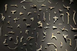 knitted military uniforms, animal bone, horn, teeth, dice, glass, leather boxing gloves, pool ball, wire and plastic, 20 parts: ranging from 102 x 58 x 31 cm to 190 x 45 x 42 cm