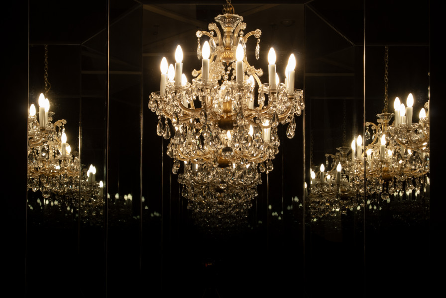 Chandelier with Pain is a hexagonal glass prism encasing a glittering chandelier. The interior walls are mirrored, multiplying the chandelier's lighted branches to infinity. Like a hypnotic jewel, the mesmerizing object slowly rotates in the centre of the glass space, continually and subtly altering the countless reflections. The numerous elements of the richly ornamented chandelier proliferate into the distance, forming boundless fields of crystals and light. Kusama’s use of repetition overwhelms the senses, obliterating the viewer’s sense of self. Her exquisite chamber of echoed light and refracted radiance is also a window into an interior space of existential anguish and obsessive thought.